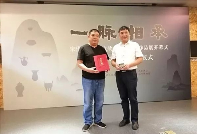 当日上午,《一脉相承:宋代名窑精品文物与当代大师作品展》暨当代陶瓷艺术大师作品捐赠仪式在杭州博物馆举行。杭州西湖风景名胜区党委书记、管委会主任翁文杰等领导向无偿将作品捐赠给杭州博物馆的8位陶瓷艺术大师颁发证书。浙江省文物局、浙江省博物馆学会、杭州西湖风景名胜区等相关领导出席捐赠仪式。