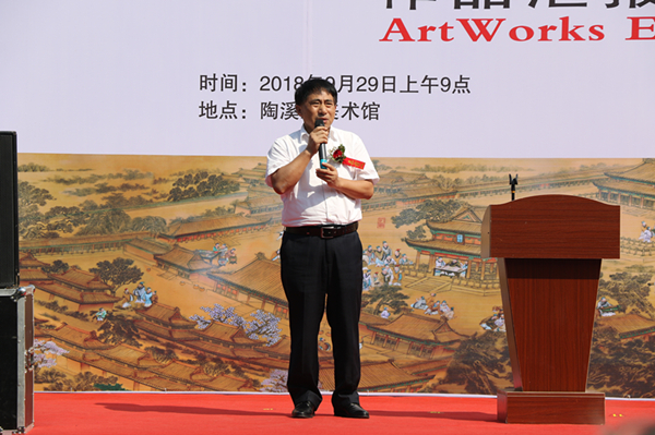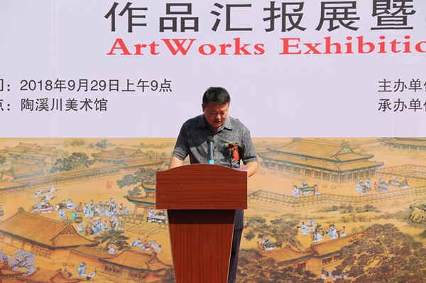 在作品展开幕式上,景德镇陶瓷大学校长宁钢、景德镇学院院长陈雨前、景德镇陶瓷大学周国桢教授、文化部中国文化传媒集团艺术品评估委员会上海工作站主任、国家艺术基金评委陈海波致辞,景德镇陶邑文化发展有限公司副总经理刚好、授课教师代表朱辉球、学员代表刘德欣作了发言。
