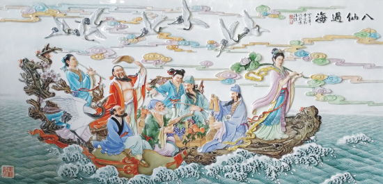 曹爱勤作品:粉彩雕刻瓷板画《八仙过海》