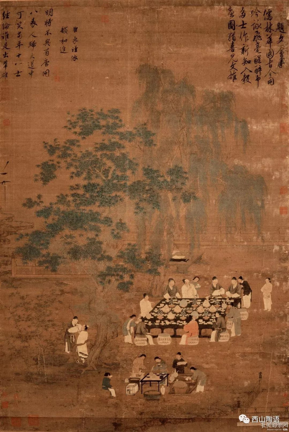 宋徽宗赵佶对茶极其痴迷,著有《大观茶论》,在《大观茶论》中,详细品鉴了茶和茶器,还介绍了茶的冲点方法。现藏于台北故宫博物院的《文会图》,是否出自宋徽宗的亲笔,虽然目前尚无定论,但的确是凝结宋徽宗茶美学的宫廷画院作品。[1]