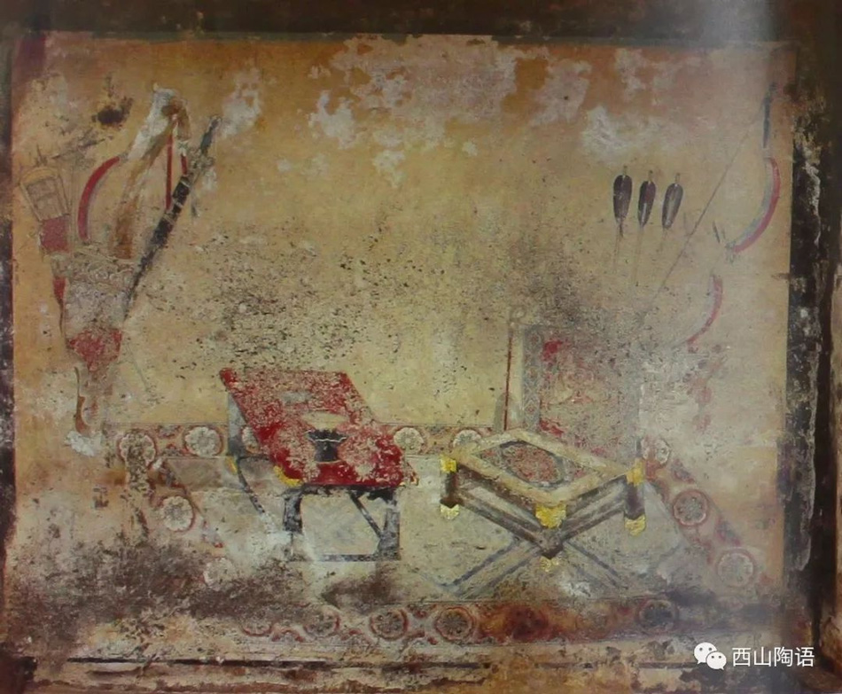 唐至北宋时期,中国北方,一直是汉族与契丹族杂居。南宋时期,北方被金统治。所以北方墓室壁画的茶道图中的人物形象既有汉族的,也有契丹和女真等少数民族的。墓室壁画中的茶道图既有民族特色,也有民族融合。1993年至1996年发掘的内蒙古宝山辽墓的壁画是迄今为止最早的辽代墓室壁画。[7]宝山辽墓中茶道图(图7)表现在一个炕桌上摆放着茶托和茶盏,但是周围并没有表现儒家文化趣味的书画和琴;而是在墙上挂着一张弓;这显然是策马沙场,狩猎为生的契丹人的茶文化。