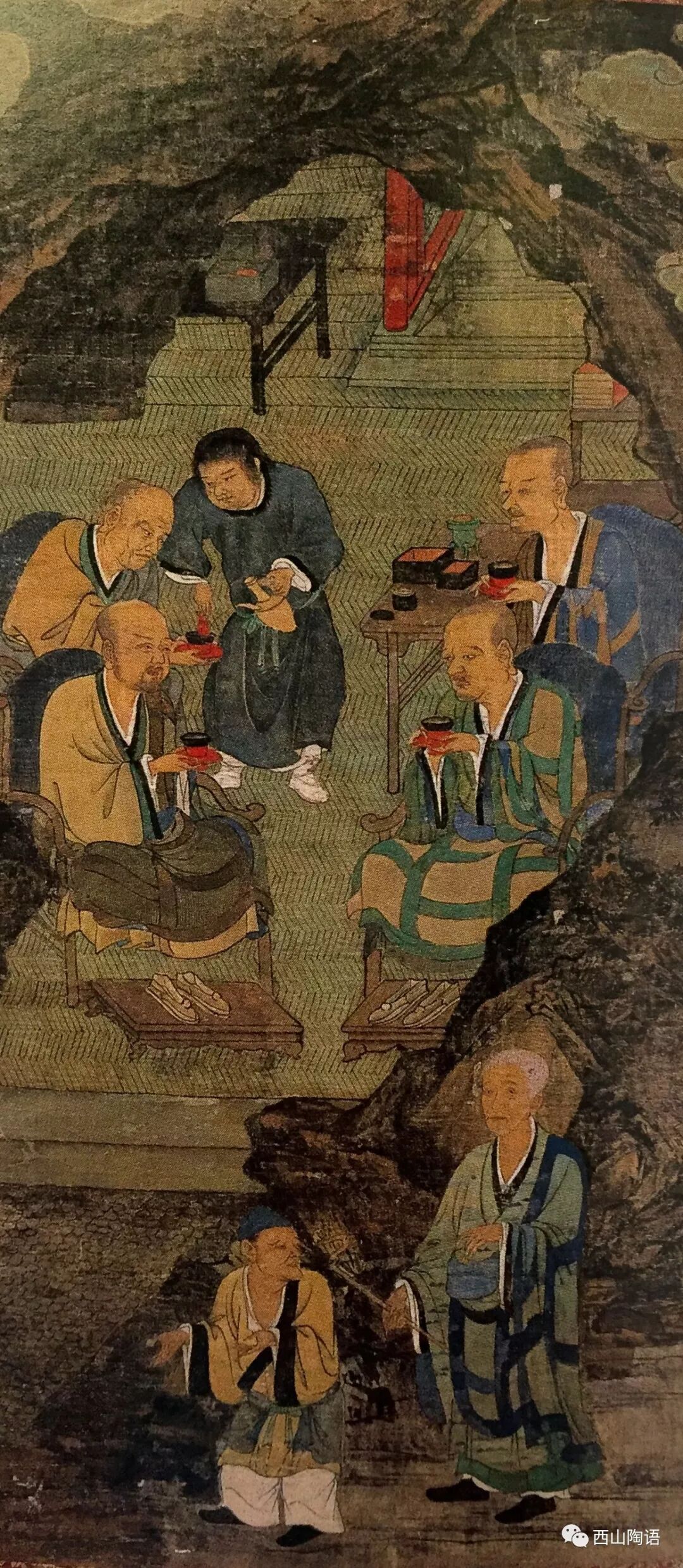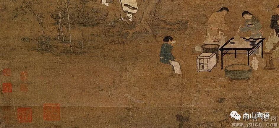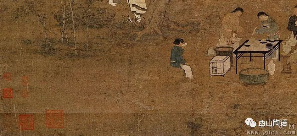 宋代的皇帝给文人宽松自由的环境,优裕的待遇。宋代文人各种雅集也非常普遍,在才华出众的学者周围,会自然而然的形成有相同志趣和相近文化修养的圈子,在不断的交流中互相激发,促使了许多文学名篇的诞生。在这些集会中,茶事必不可少的组成部分。描绘这些活动的茶画,在北宋李公麟的《山居图卷》中(图2),文人与僧人的在山林间坐而论道的场景,在这幅画中也描绘有仆役在备茶点茶的画面。