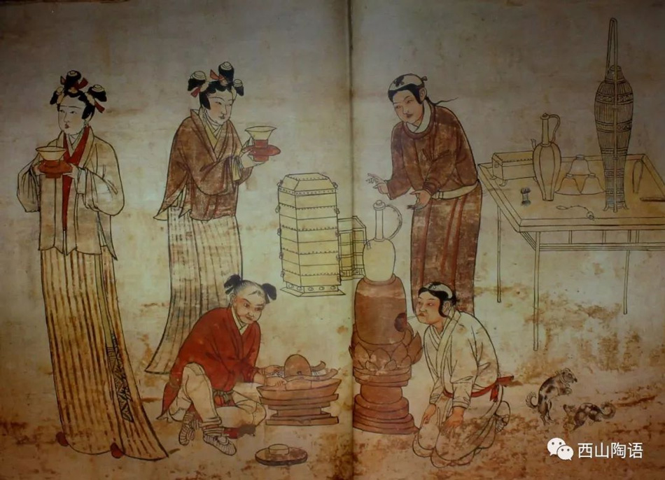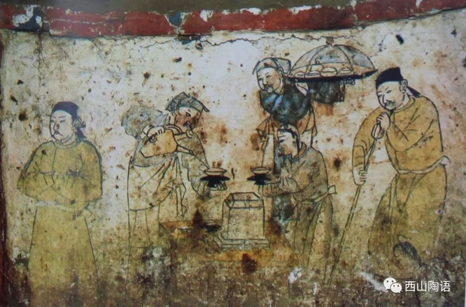 随着宋代文化向辽金地区的扩散,宋辽金墓葬中出现了许多备茶图。其中最有影响的就是张家口宣化辽墓茶道图的发现。这个墓葬群是由张氏和韩氏两个大家族共八代组成。在墓室里发现大量散乐、备宴、读经、备茶图。而且画面清晰完整,人物刻画生动自然。在备茶图中(图12)女仆和男待是汉族人,而吹火烧水和碾茶的小童都是髡发,象是契丹人。在这些备茶图中,茶碾,茶入、汤瓶、茶盏、茶托等常规茶器。在另一幅备宴图中(图13),出现了茶钵、茶勺和渣斗。茶钵与茶勺是用来为多人点茶分茶的茶器。茶钵即口径和容积较大的陶瓷器,虽然无论是《茶具图赞》,还是《大观茶论》中都不曾单列出来讨论的器物。[13]宋代在聚会和宴席中,为多人点茶时,常常使用茶钵。