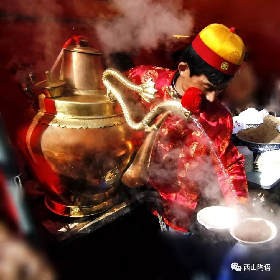 八角村金墓壁画冲点茶汤的方式,很容易让人联想到今天庙会的京津特色小吃——茶汤(图15)。茶汤又称面茶,但其实原料里并无茶,而是粟子面和核桃、芝麻干果料面、红糖面混合,完全凭借沸水冲点熟后饮用。[15]京津茶汤的历史非常悠久,但始终未找到源头。使用体量庞大的铜壶,原料里无茶,但是与八角村金墓壁画冲点茶汤的方式,相同的冲点方法和原料的粉末状,以及那个有名无实的“茶”字,都在揭示这种古老小吃与宋代点茶的历史渊源。