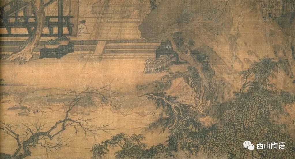 宋代元祐年间,苏轼为代表的苏撤、秦观、黄庭坚等文人,多次前往驸马王铣的宅邸——西园,举行弹琴、赋诗、论道的雅集。李公麟为这个雅集创作了一幅作品《西园雅集》。后因与新党政见不合,苏轼和元祐党人纷纷被弹劾流放。后人把这些人品高洁又才华横溢的文人集会,变成绘画中的永恒主题,从宋到明清反复在表现,现存的《西园雅集》有八十多幅之多。[2]现藏美国纳尔逊—阿特金斯艺术博物馆的南宋画家马远的《西园雅集》(图3)中就画了文人饮茶的场景。在廊前,有茶炉和执壶、茶箱等物。[3]