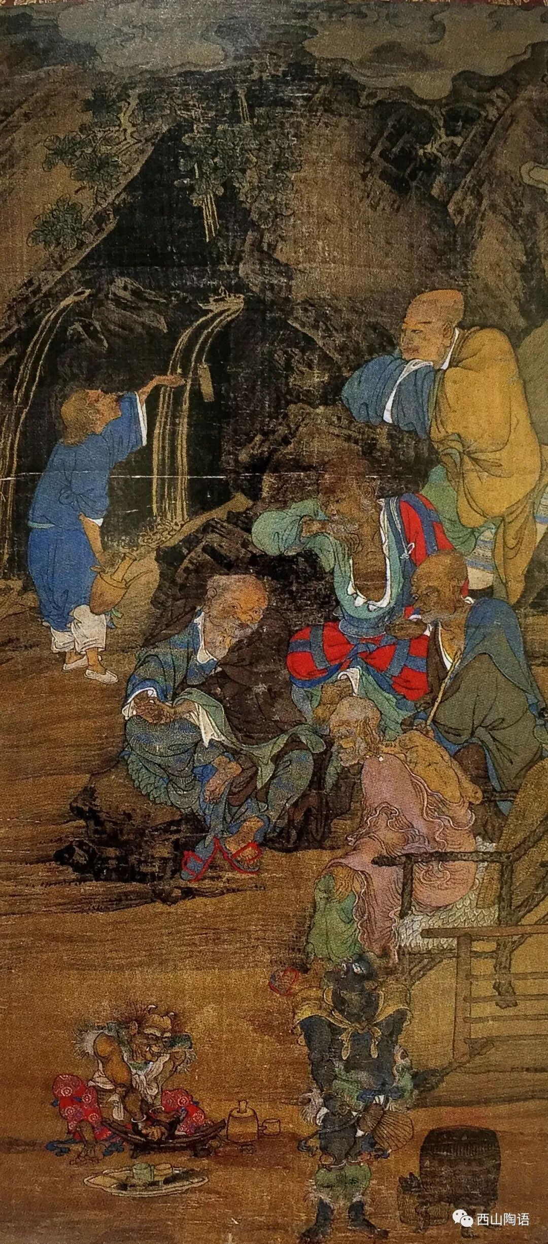 《五百罗汉》中另一幅是备茶图(图9)。在画面中五位罗汉坐在山石上,目光集中在正在备茶的三个夜叉。左上角夜叉一手持汤瓶,一手持竹筒正在收集山泉水。左下角一个夜叉正在用茶碾碾茶。在他旁边是一个木茶臼,宋代茶饼要用茶臼木槌击打成小块,再放入茶碾中碾成细茶末。茶碾边有一个托盘,里面是茶入和收集茶末的茶帚茶簸箕。第三个夜叉手持蒲扇,一边向远处张望看着取水的夜叉,一边在照顾茶炉与炭火,茶炉边是炭篓。《茶经》说“其火,用炭,次用劲薪。……其水,用山水上,江水中,井水下”。这幅罗汉图的取水煮茶方式正与陆羽《茶经》中一致。