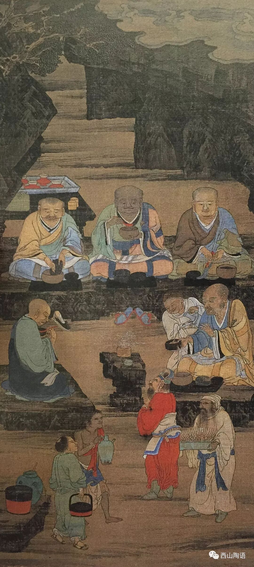 《五百罗汉》中第三幅茶画的主题是“四头茶礼”前的用餐(图10)。五位罗汉盘坐在山石上,由几位供养者服侍用餐。在罗汉身后的桌案上摆放着四套茶盏和两个茶入。