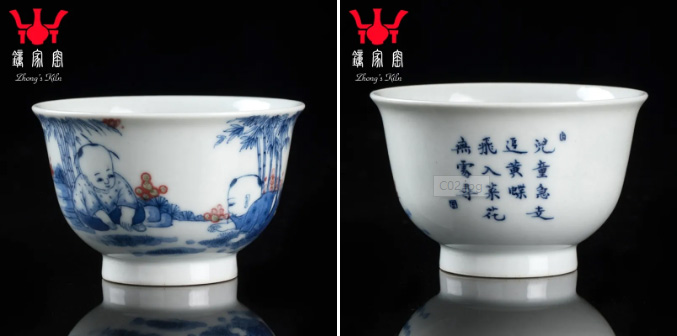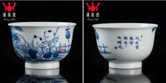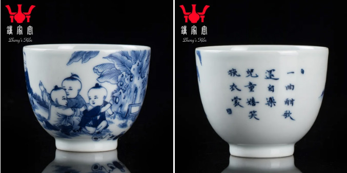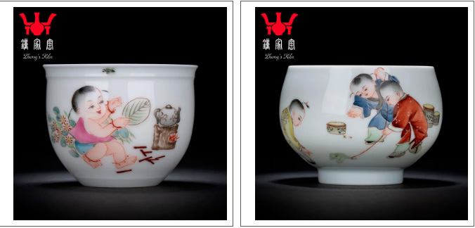 在传统的婴戏纹上,我们将本土文化与外来文化相结合,研究创新,打造出三款各具特色的童趣杯,分别是《童子打闹》、《童子提灯》、《竹林童趣》,杯子有两种器型,撇口杯和直口杯。