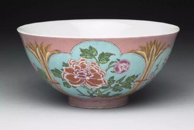 珐琅彩瓷粉红地开光四季花卉碗
