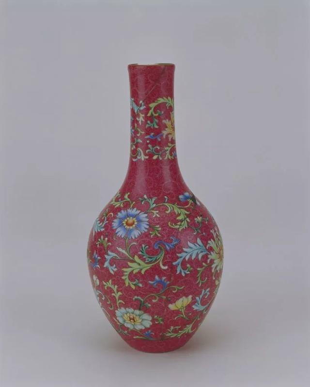 胭脂紫轧道珐琅彩直颈瓶