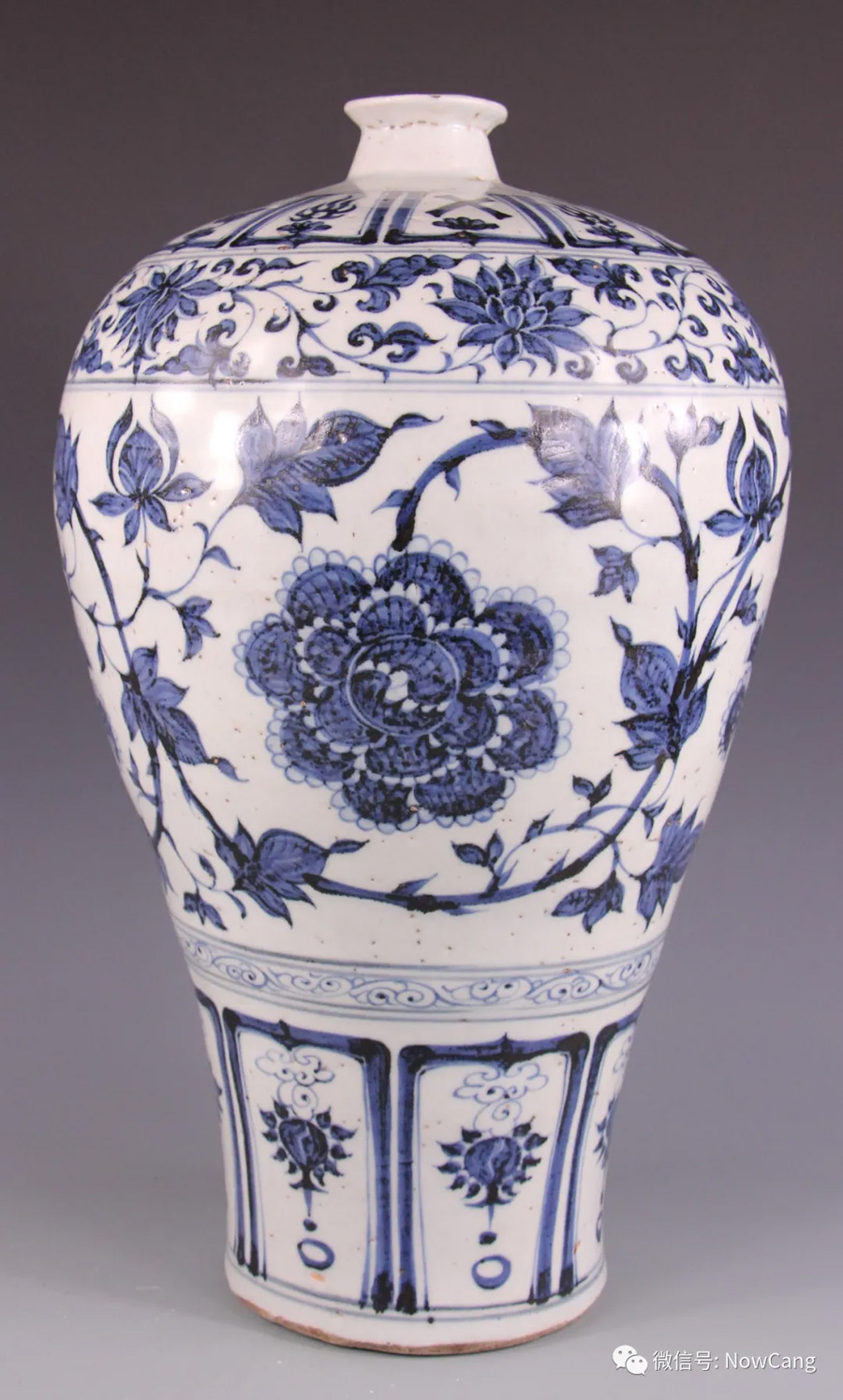 元青花造型丰富,以大件器为主,胎体厚重,器形硕大,梅瓶、玉壶春瓶、盖罐、扁壶、大盘、高足杯等,大气稳重而不失精致。