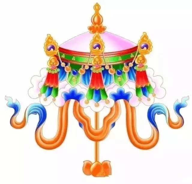 宝伞,藏语称“斗”,象征佛陀教诲的权威。古印度时,贵族、皇室成员出行时,以伞蔽阳,后演化为仪仗器具, 寓意为至上权威。佛教以伞象征遮蔽魔障,守护佛法。藏传佛教亦认为,宝伞象征着佛陀教诲的权威。