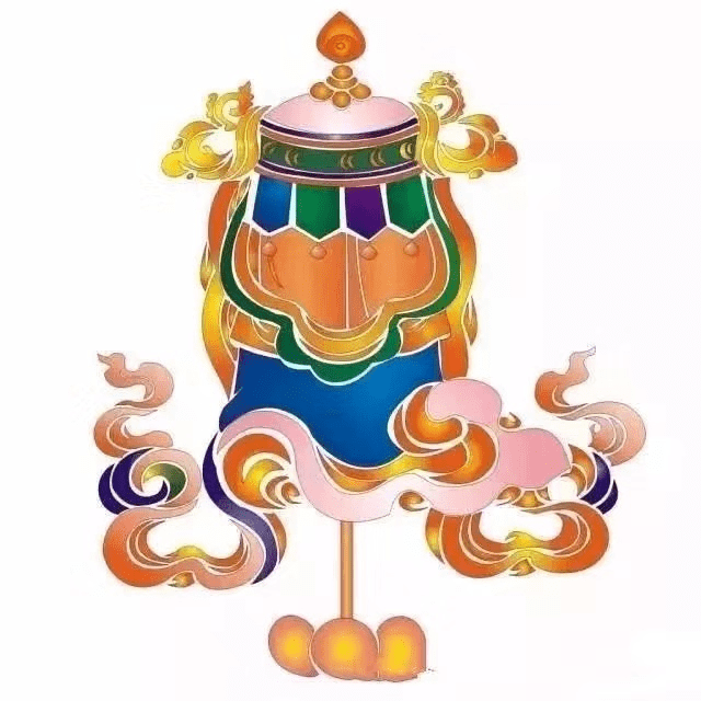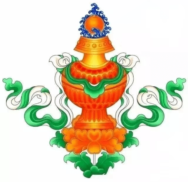 宝瓶,佛陀的喉咙,藏语称“翁巴”,又称为不朽的花瓶。藏传佛教寺院中的瓶内装净水(甘露)和宝石,瓶中插有孔雀翎或如意树,象征着 吉祥、清净和财运,有 俱宝无漏、福智圆满、永生不死之意。