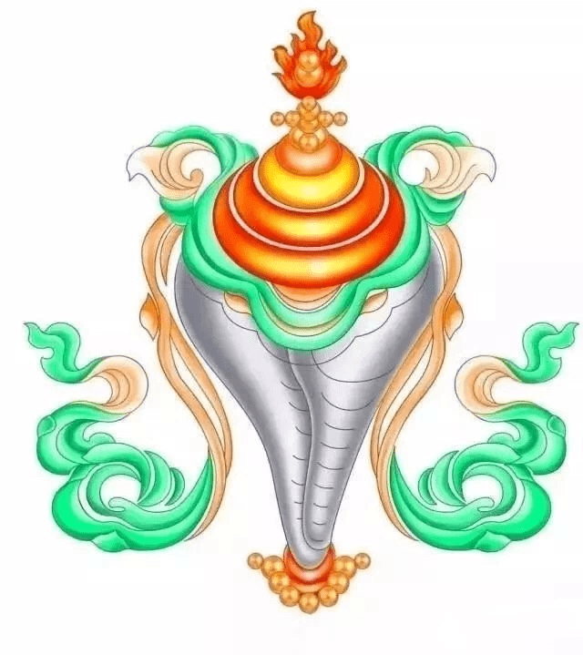 白海螺,藏语称“东尕”,又称法螺贝。佛经载,释迦牟尼说法时声震四方,如海螺之音,故今法会之际常吹鸣海螺。在西藏,以右旋白海螺最受尊崇,被视为名声远扬三千世界之象征,也即象征着 达摩回荡不息的声音。