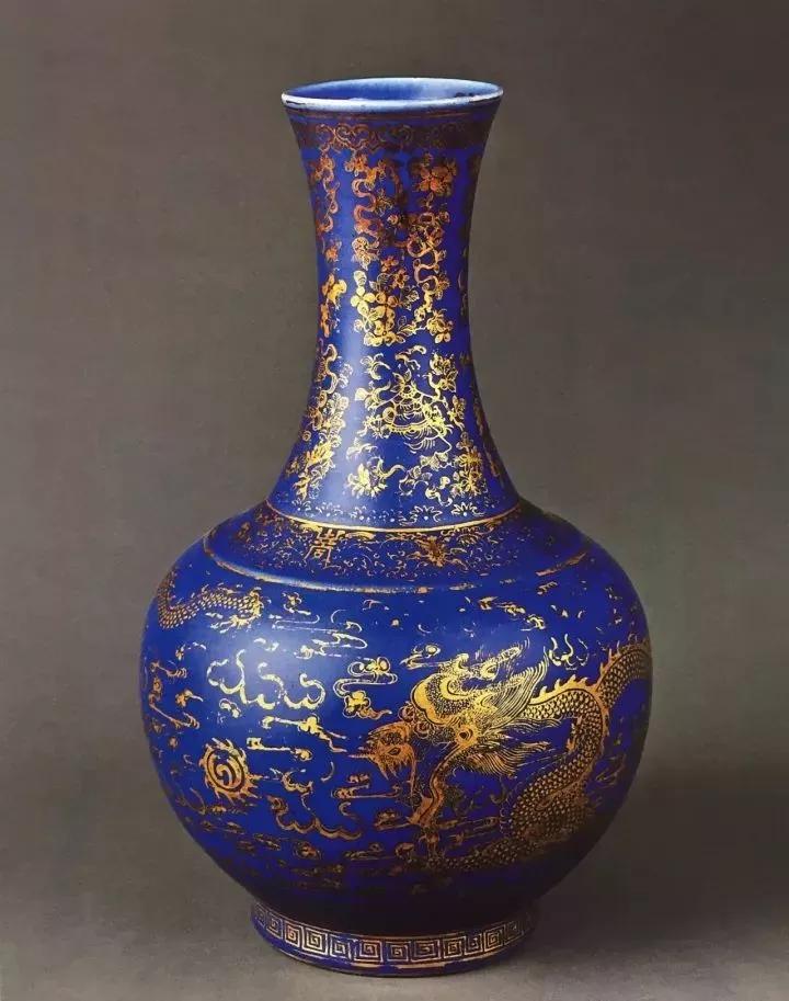 清光绪祭蓝釉金彩双龙戏珠纹赏瓶