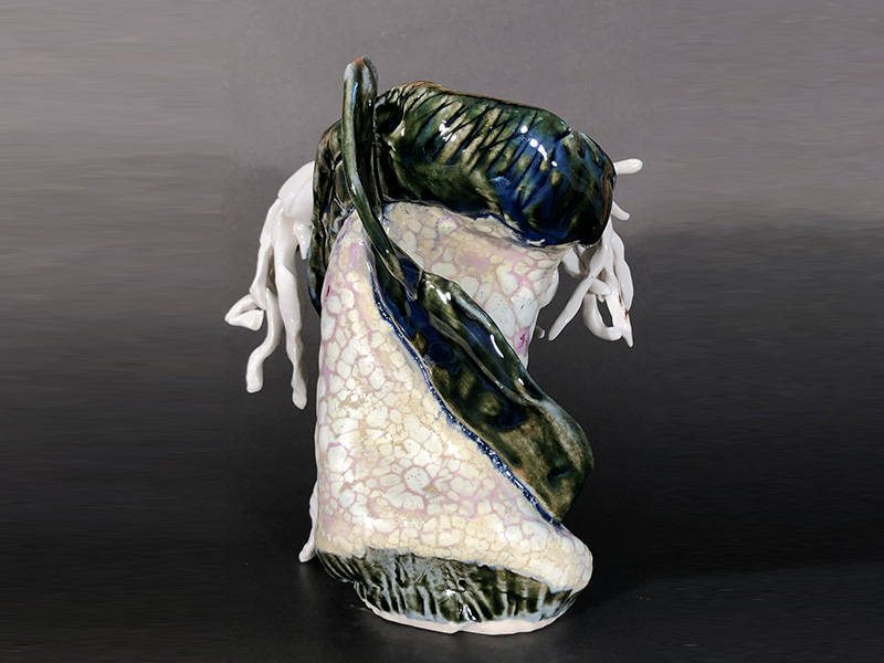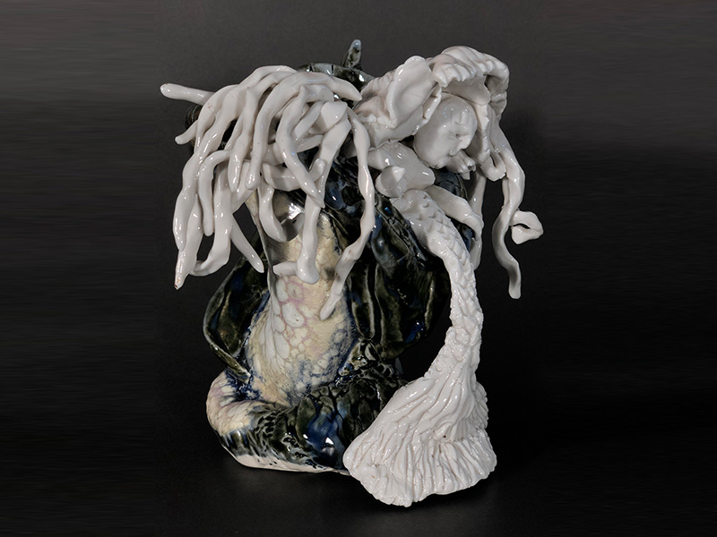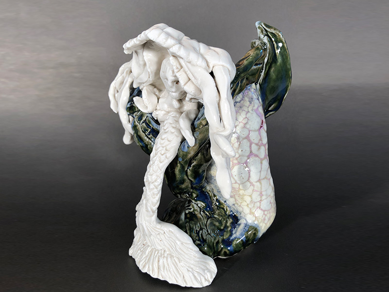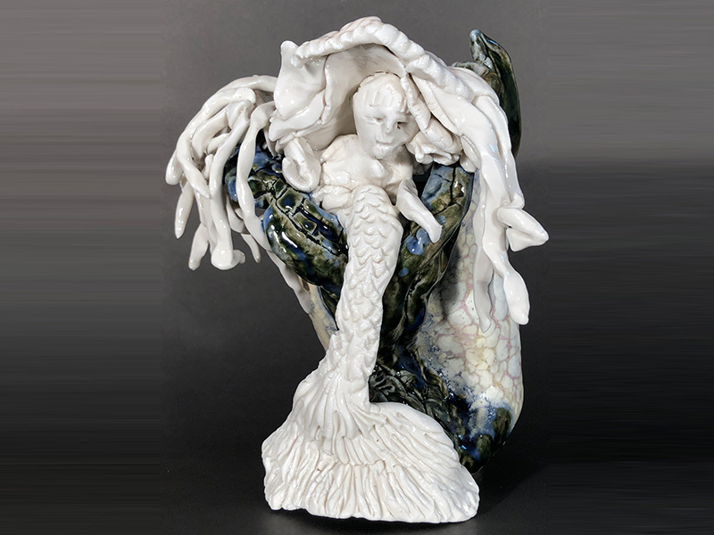 This piece creates awareness of the terrible contamination of our waters. Jelly fish blooms on warm and low oxygen waters. Here a fatigued old jellyfish lady meditates exhausted at the edge of a base shell like form. Her tentacles, as hairs, are falling and decaying. On her left eye a tear is about to run on her cheek. The texture and finishing on the piece makes us have the feeling of an underwater scene.
