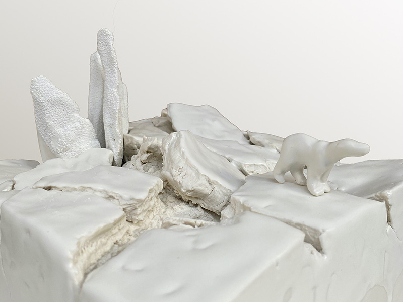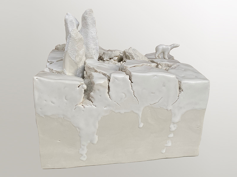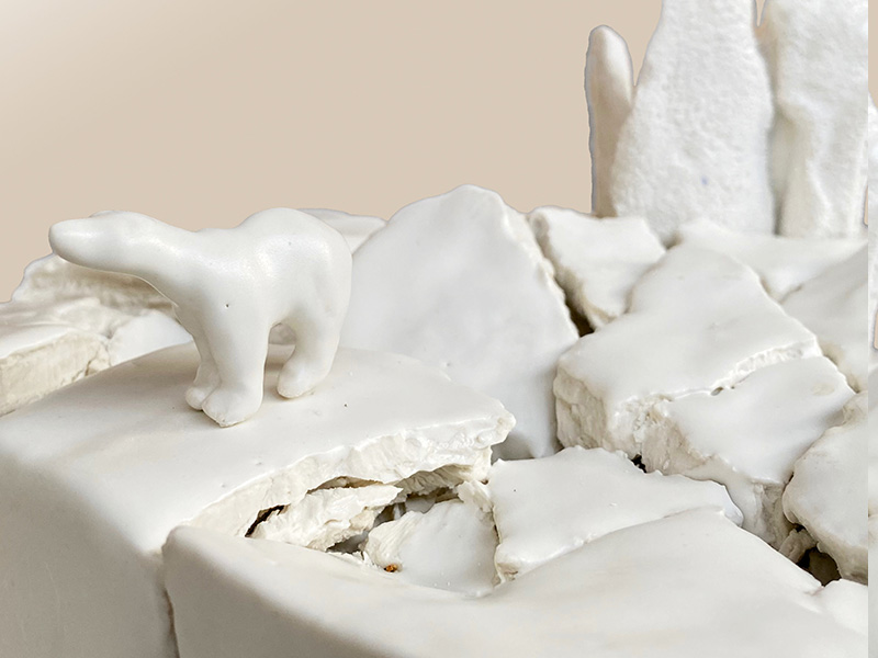 From a porcelain block I did crackles with a heatgun. Then I pushed inside from the bottom to create brocken ice. I added some long pieces glazed with white sand. A polar bear on the edge trying to escape or maybe asking help…