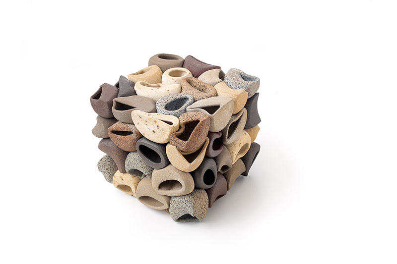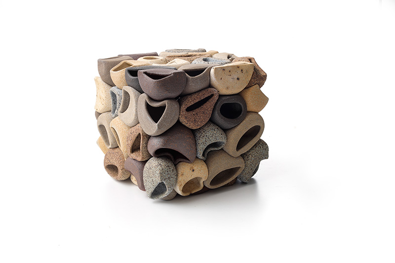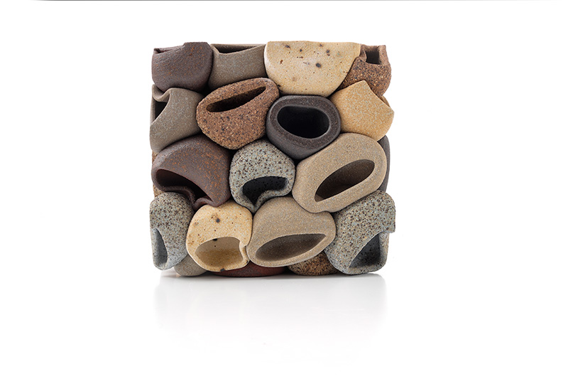 Karin Putsch Grassi’s recent production, her Figulinae series, has two aspects that were evident in her early work in the 1980’s: connections and compressions. The name of this series derives from the Figulinaes, small vases and statuettes, which were produced in great quantity in Figline Valdarno, near Florence, where the artist has lived throughout her working life. Karin Putsch Grassi’s pieces are compositions, created by putting together multiple elements, small thrown forms, to form a new entity. What Karin Putsch Grassi wants to achieve is a tension and interest between the compressed individual elements and the new identity of the connected and compressed form. The act of compression connects a multitude of individual forms. And each piece is unique not just because the individual elements in each object can be different but because the act of creation, through combination and compression, is infinitely variable. The small individual pot forms lose, in an act of artistic pressure, any vestige of function and emerge transformed in a new form as of a work of art.