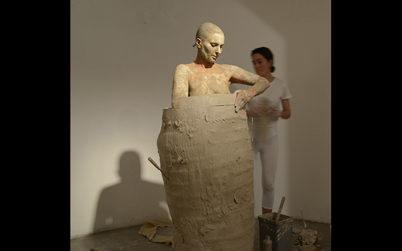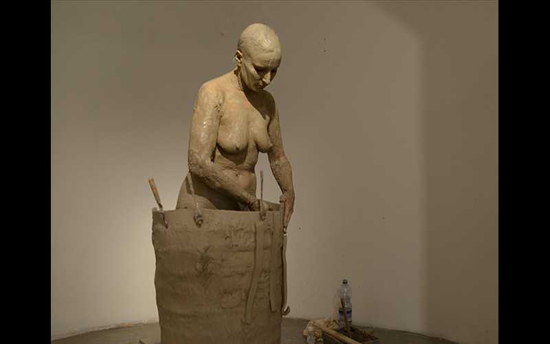 From my work processes with earth as my medium, including my years of facilitating classes for people with special needs, arose a series of performances titled “Working From The Inside”. With clay, on psychological levels, I find we're simultaneously working as much internally as externally. I work from the inside of a large scale vessels as I build, making a second skin around myself, shaping the clay as it shapes me, both myself and vessel pushed and pulled to limits. This experience is somewhere been wrestling and allowing the clay to find its own form. Raw clay is malleable and working with it requires listening in many ways. Blignaut, in collaboration with musician hashtag_blacknoise, records the sounds of the making process from digging clay to the making of the work with a microphone on the inside, an earthy heartbeat with noise. This audio accompanies the live performance.