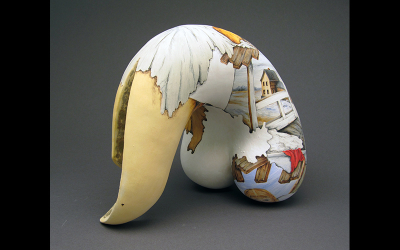 In my work I combine an abstract curvilinear sculptural form with surreal narrative painting in order to create an illusion of dynamically changing reality. I build with clay and paint with underglazes. I create an impression of interchangeability between flat image and three-dimensional form. Every sculptural form has a distinctive shape and painted narrative is not simply a decoration but a harmonious continuity of the intended message.