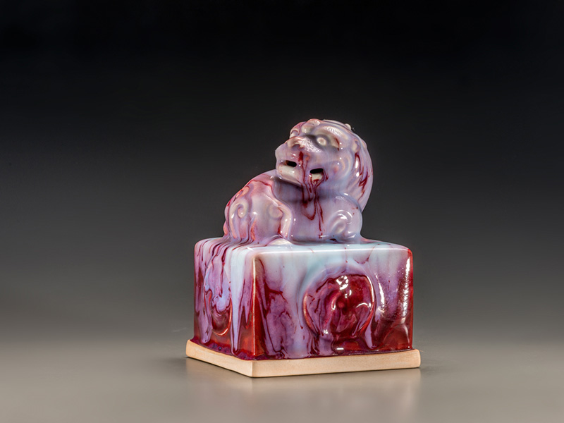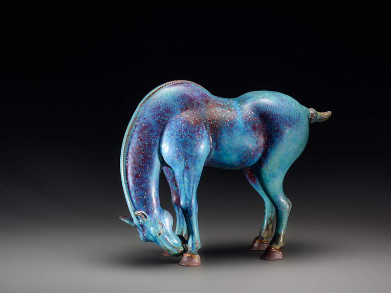 Wang Xianfeng also attaches great importance to the innovation of Jun porcelain craftsmanship. In his Jun porcelain "Horse Stepping on a Flying Swallow", a curved horse leg has to support the weight of the whole body, and the difficulty can be imagined. Moreover, when the furnace temperature is 1300°C, the utensils have softened into mud, and a slight change in the environment will crack, collapse and be scrapped. In order to develop this work, Wang Xianfeng overcame numerous difficulties in molding, clay, glaze color, and firing. After hundreds of tests, he finally overcome the technical problems of single-leg bearing and handling the high temperature of 1300℃. Jun Porcelain's "Horse Stepping on a Flying Swallow" not only perfectly demonstrates the artistic charm of the original bronzes of the Eastern Han dynasty, it is the first time that it reproduces the charm of traditional Chinese culture, including the sense of strength, the rhythm of movement, elegance and lightness, and beauty Successfully realized on Junci.