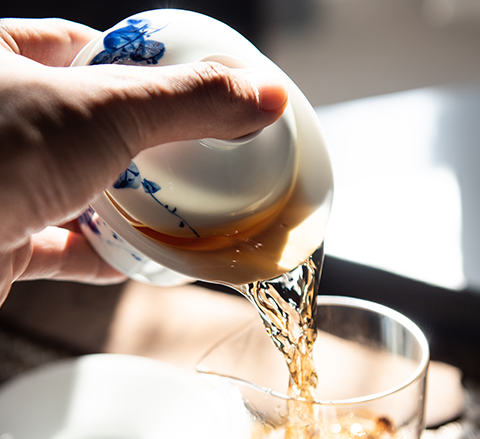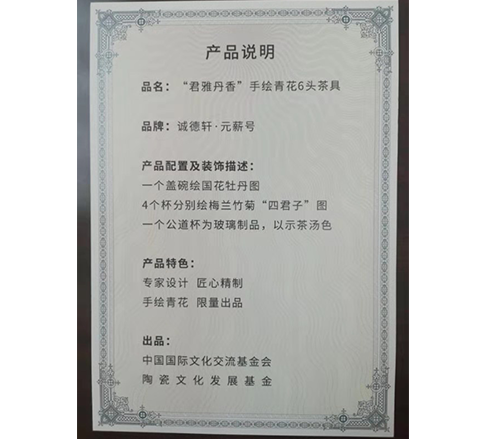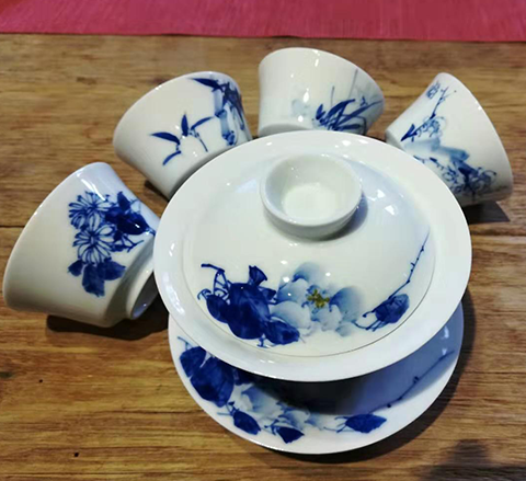 One cover bowl is painted with a picture of Chinese painting peony, four cups are painted with a picture of the "Four Gentlemen" of plum, orchid, bamboo and chrysanthemum, and one fair cup is made of glass to show the color of tea soup