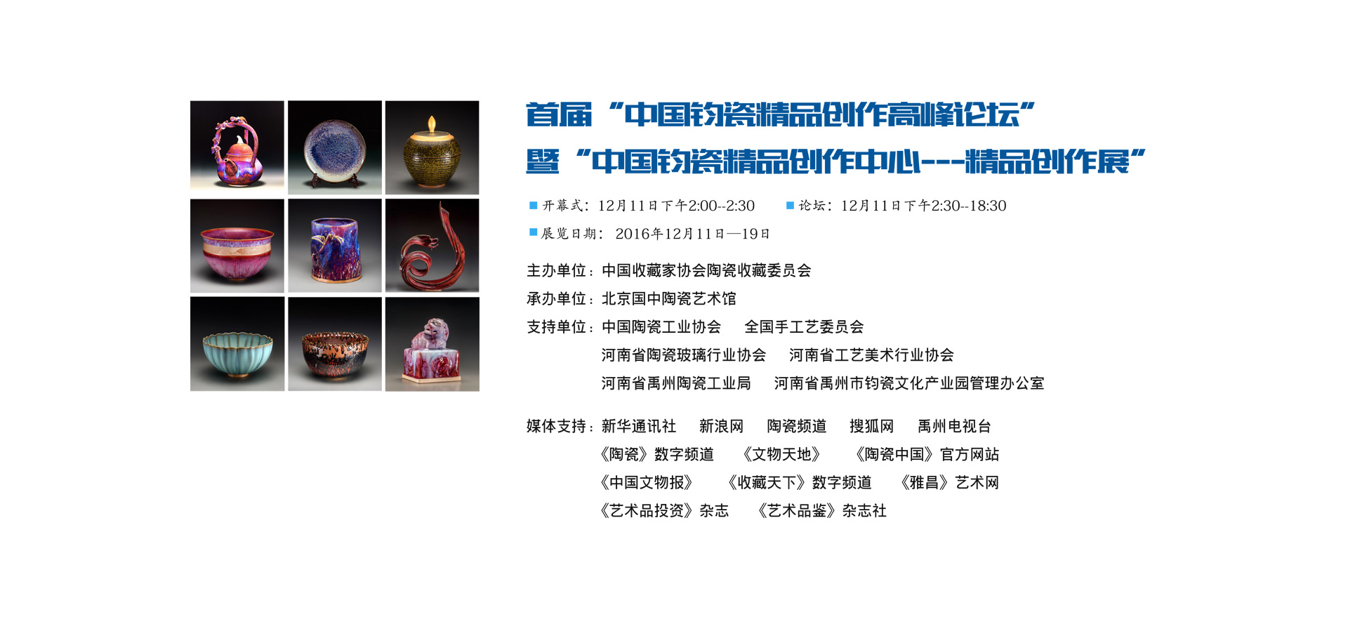 In order to promote contemporary art of Jun porcelain on the road of high-quality goods, the "Ceramic Collection Committee of China Collectors Association" and "Yuzhou Municipal People's Government of Henan Province" and "Beijing National Ceramic Art Museum" were held on December 11-19, 2016 , Jointly held the first "China Jun Porcelain Fine Creation Summit Forum" and "China Jun Porcelain Fine Creation Center --- Fine Creation Exhibition" in Beijing.