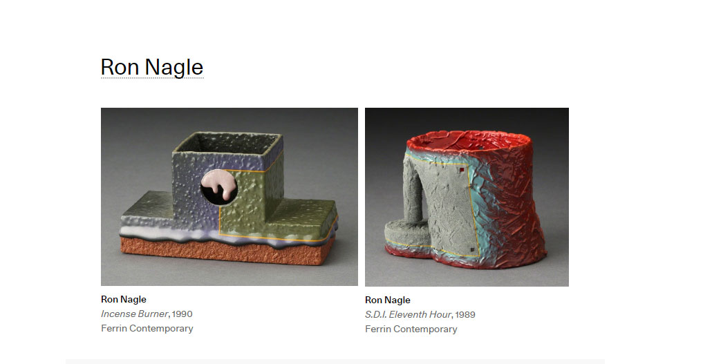 California artist Nagle is one of the grand masters of his medium, with an approach to technique that is unsurpassable. These small works were given a large vitrine in Massimiliano Gioni’s Encyclopedic Palace at the 55th Venice Biennale. Nagle’s perfect sculptural objects employ texture, shape, and colour, feeling like the output of an alien informed by low-rider culture and Japanese zen philosophy.