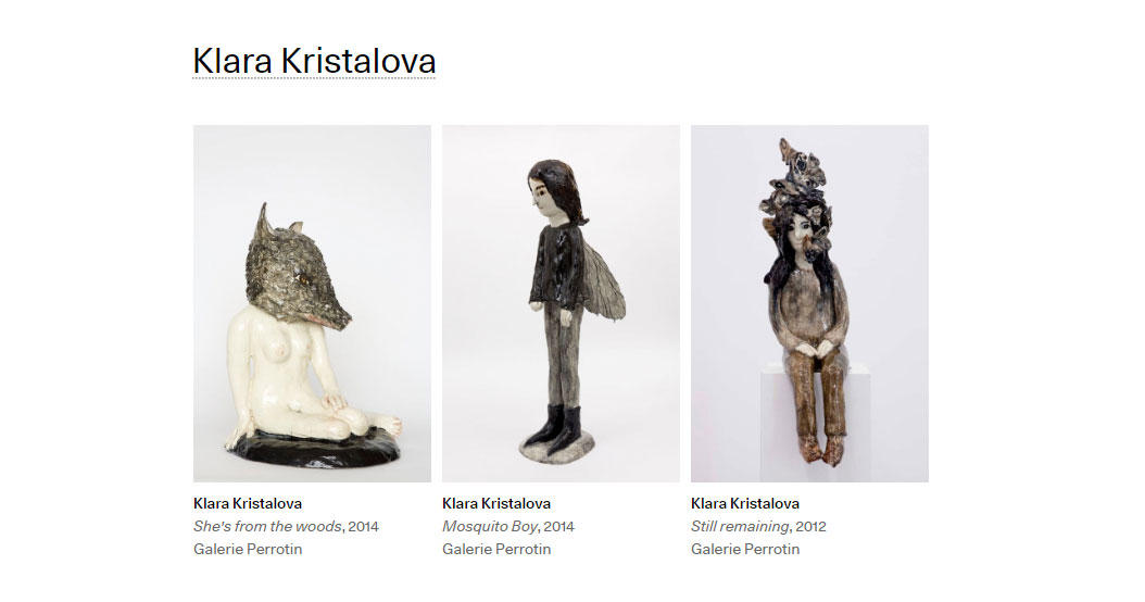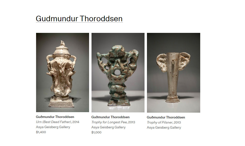 One of the highlights of NADA in New York in 2014, this Icelandic artist’s earthenware trophies play with ideas of masculinity and the iconography of religious idols. His figurative clay objects have a sense of haphazard functionality mixed with a good dose of humour and narrative freedom. Often they are exhibited alongside works on paper depicting male characters playing sport, hanging  out, and drinking beer.