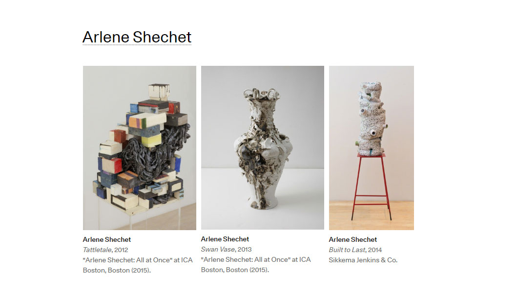 The concept of the vessel is reconsidered in the fat, porous, sprawling ceramic objects of this American artist. The straight lines of kiln bricks contrast to rough, bubbling skin-like textures within single pieces. She also recently appropriated the moulds at the Miessen porcelain factory in Germany for a series of offbeat and irregular reinventions of classical china.