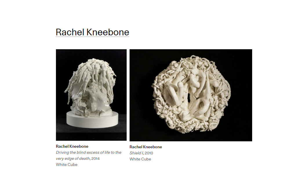 heritage of porcelain, British artist Rachel Kneebone’s white sculptural works are innately sensual. Her amalgams of miniature limbs and curves appear to run fluidly into clusters of delicate forms and figures. The white pieces reference ancient Greek sculpture and the erotic surrealism of Bellmer, and resemble Rodin’s Gates of Hell re-imagined in the form of ice cream.
