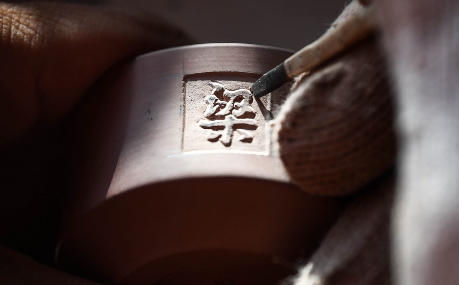 A member of the Lu Jingping team carves a Chinese character on a Nixing pottery pot in Qinzhou City, south China's Guangxi Zhuang Autonomous Region, Nov. 9, 2020. (Xinhua/Zhang Ailin)