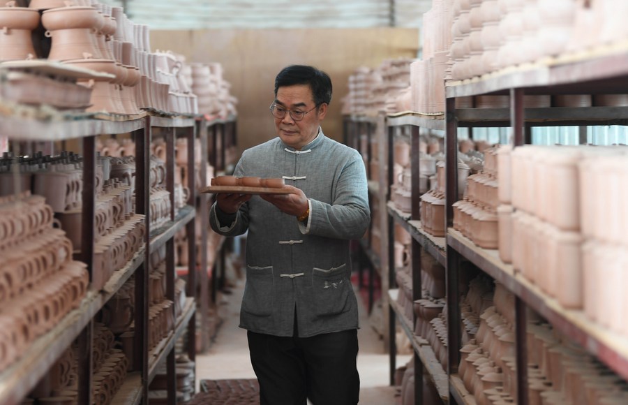 Lu Jingping checks the quality of a Nixing pottery ware in Qinzhou City, south China's Guangxi Zhuang Autonomous Region, Dec. 3, 2020. (Xinhua/Zhang Ailin)
