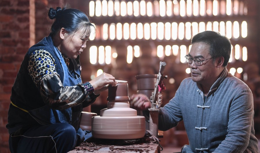 Lu Jingping guides a worker to plane a Nixing pottery ware in Qinzhou City, south China's Guangxi Zhuang Autonomous Region, Dec. 2, 2020. (Xinhua/Zhang Ailin)