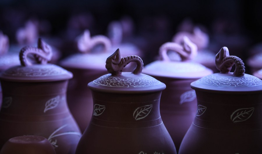 Unfinished Nixing pottery wares waiting to be fired are seen at Lu Jingping's kiln in Qinzhou City, south China's Guangxi Zhuang Autonomous Region, Nov. 9, 2020. (Xinhua/Zhang Ailin)