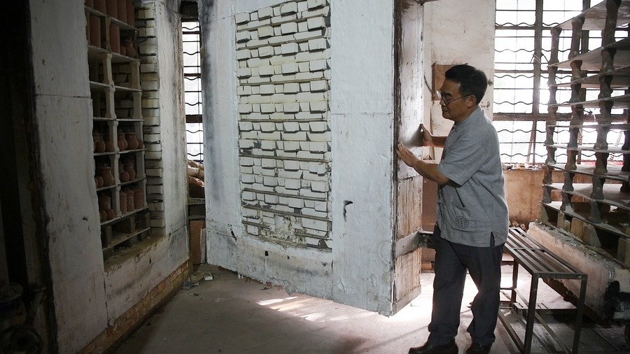 Lu Jingping closes the door of the kiln for firing Nixing pottery wares in Qinzhou City, south China's Guangxi Zhuang Autonomous Region, Nov. 26, 2020. (Xinhua/Zhang Ailin)