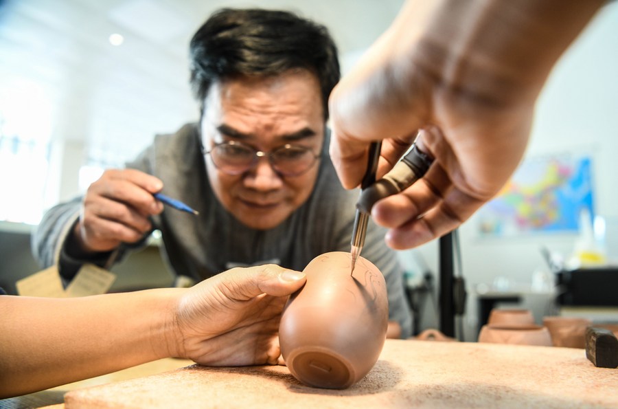 Lu Jingping guides an apprentice to carve patterns on a Nixing pottery ware in Qinzhou City, south China's Guangxi Zhuang Autonomous Region, Dec. 4, 2020. (Xinhua/Zhang Ailin)