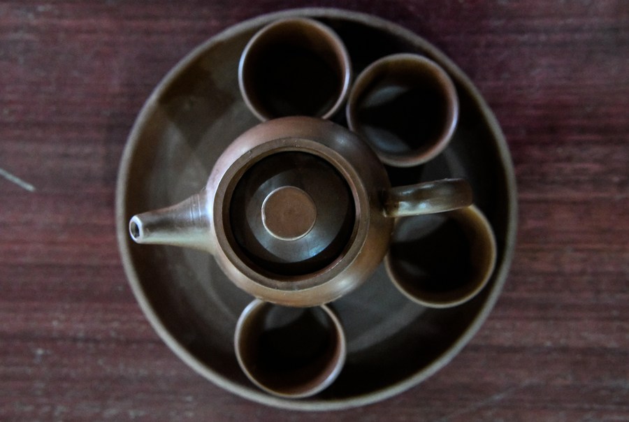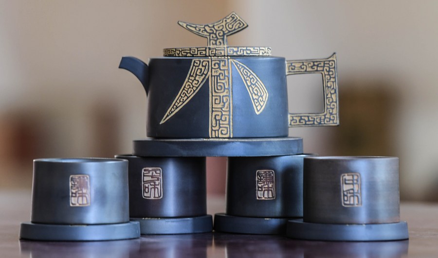 A set of Nixing pottery wares made by Lu Jingping in the late 1980s are displayed in Qinzhou City, south China's Guangxi Zhuang Autonomous Region, Nov. 5, 2020. (Xinhua/Zhang Ailin)