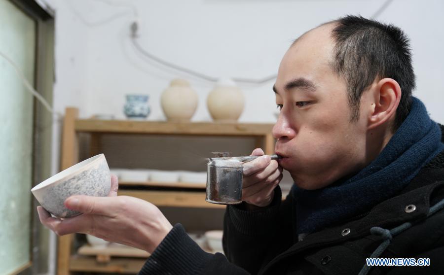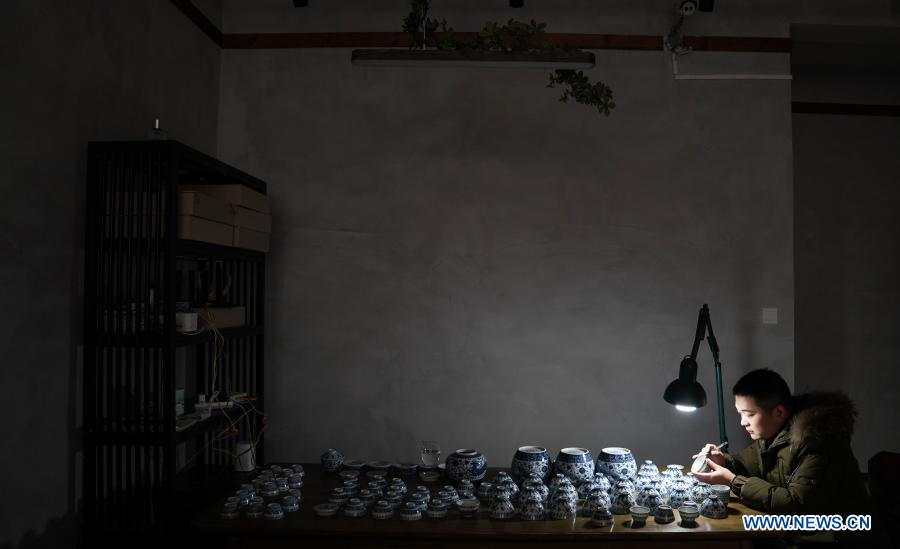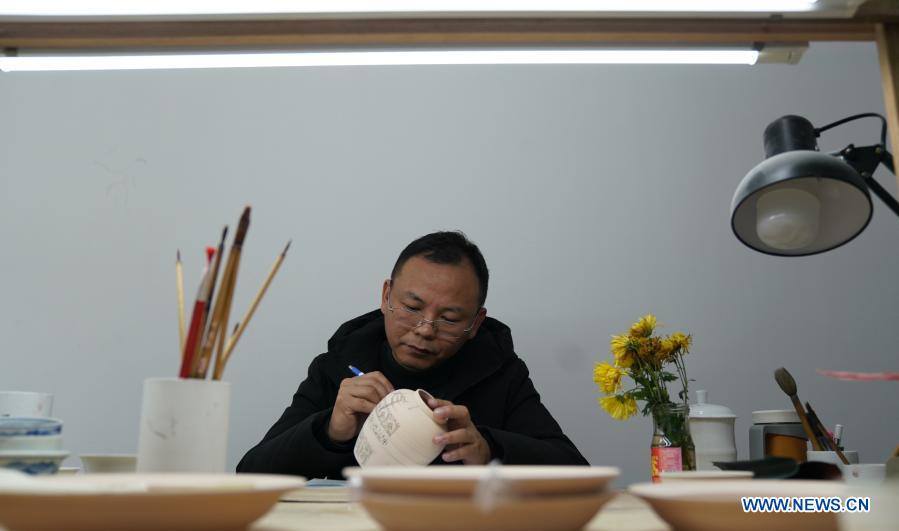 A staff member of Kuaixueshiqing, a handicraft porcelain making team, draws on a jar in Jingdezhen, east China's Jiangxi Province, Dec. 23, 2020. The Kuaixueshiqing team based in Jingdezhen, known as China's porcelain capital, produces porcelain bowls and cups by combining multiple techniques. The team has more than 10 varieties of products, favored by both domestic and foreign consumers. (Xinhua/Hu Chenhuan)