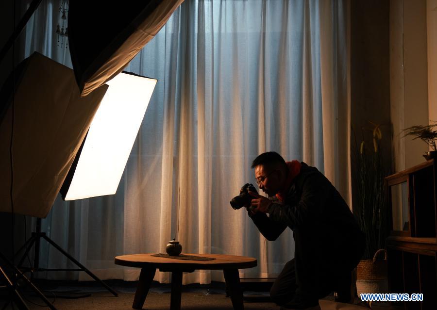 A staff member of Kuaixueshiqing, a handicraft porcelain making team, takes photos of porcelain works in Jingdezhen, east China's Jiangxi Province, Dec. 22, 2020. The Kuaixueshiqing team based in Jingdezhen, known as China's porcelain capital, produces porcelain bowls and cups by combining multiple techniques. The team has more than 10 varieties of products, favored by both domestic and foreign consumers. (Xinhua/Hu Chenhuan)