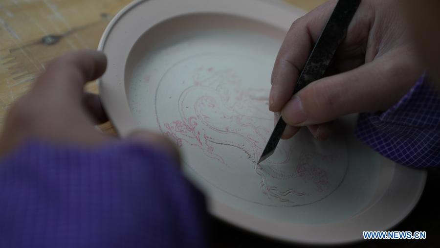 A staff member of Kuaixueshiqing, a handicraft porcelain making team, carves on a plate in Jingdezhen, east China's Jiangxi Province, Dec. 22, 2020. The Kuaixueshiqing team based in Jingdezhen, known as China's porcelain capital, produces porcelain bowls and cups by combining multiple techniques. The team has more than 10 varieties of products, favored by both domestic and foreign consumers. (Xinhua/Hu Chenhuan)
