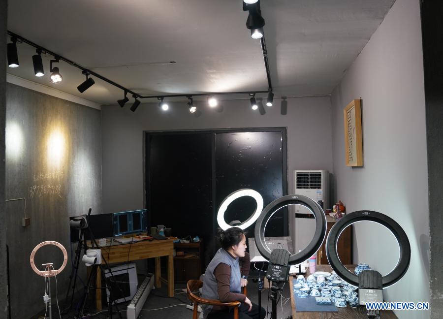 A staff member of Kuaixueshiqing, a handicraft porcelain making team, sells porcelain works via livestreaming in Jingdezhen, east China's Jiangxi Province, Dec. 22, 2020. The Kuaixueshiqing team based in Jingdezhen, known as China's porcelain capital, produces porcelain bowls and cups by combining multiple techniques. The team has more than 10 varieties of products, favored by both domestic and foreign consumers. (Xinhua/Hu Chenhuan)