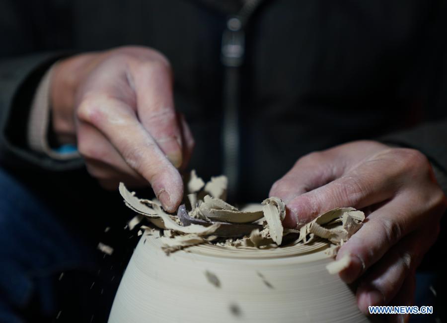 A staff member of Kuaixueshiqing, a handicraft porcelain making team, trims an unburnt product in Jingdezhen, east China's Jiangxi Province, Dec. 23, 2020. The Kuaixueshiqing team based in Jingdezhen, known as China's porcelain capital, produces porcelain bowls and cups by combining multiple techniques. The team has more than 10 varieties of products, favored by both domestic and foreign consumers. (Xinhua/Hu Chenhuan)