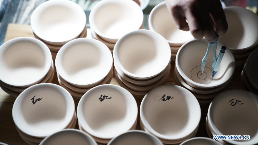 A staff member of Kuaixueshiqing, a handicraft porcelain making team, marks on a porcelain work in Jingdezhen, east China's Jiangxi Province, Dec. 23, 2020. The Kuaixueshiqing team based in Jingdezhen, known as China's porcelain capital, produces porcelain bowls and cups by combining multiple techniques. The team has more than 10 varieties of products, favored by both domestic and foreign consumers. (Xinhua/Hu Chenhuan)