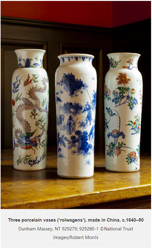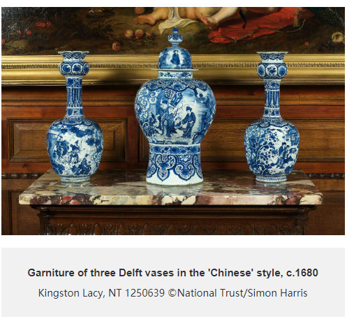 The transition from the Ming to the Qing dynasty in China was a tumultuous one and after 1647, imports came to a halt. As no new porcelain was available, French merchants turned to Dutch potters in Delft who were able to produce convincing copies of Chinese porcelain, both in terms of shape and decoration. Wealthy consumers clearly wanted ‘traditional’ Chinese shapes, including Margaret Bankes of Kingston Lacy in Dorset who purchased a garniture of three Delft pieces in the 'Chinese style' in 1698.
