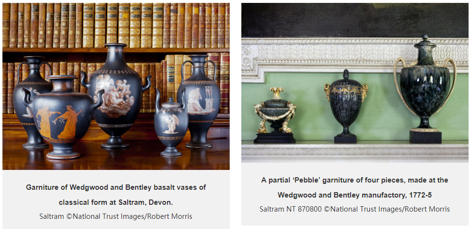Wedgwood’s black stoneware, known as ‘black basalt’ was ideal for recreating the style of Greek vase painting that flourished from the late 6th to the late 4th century BC. Hundreds of vase shapes were produced, from which customers could assemble their own garnitures.