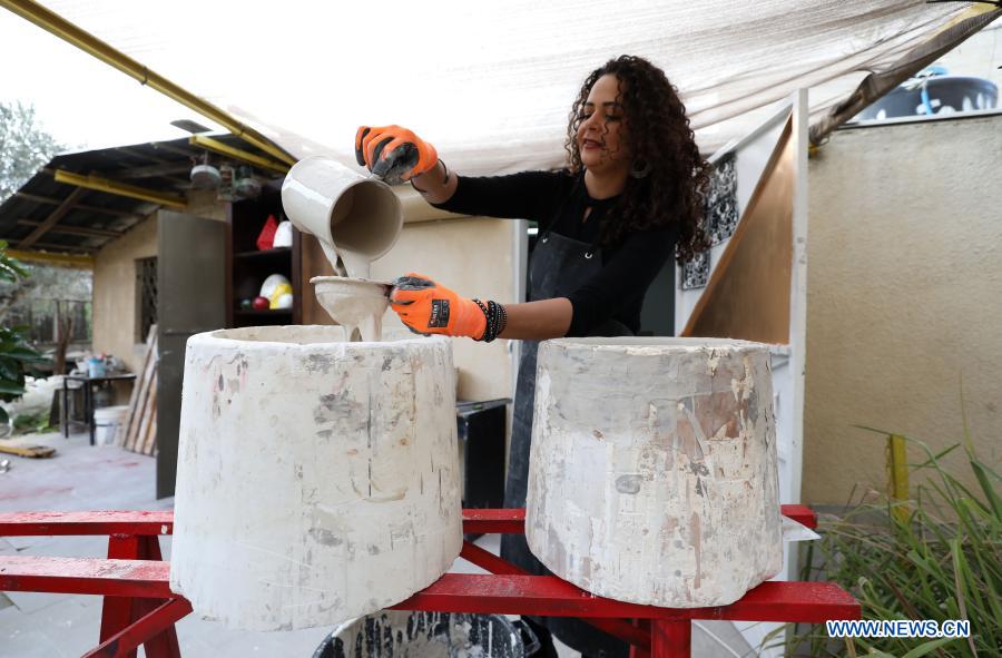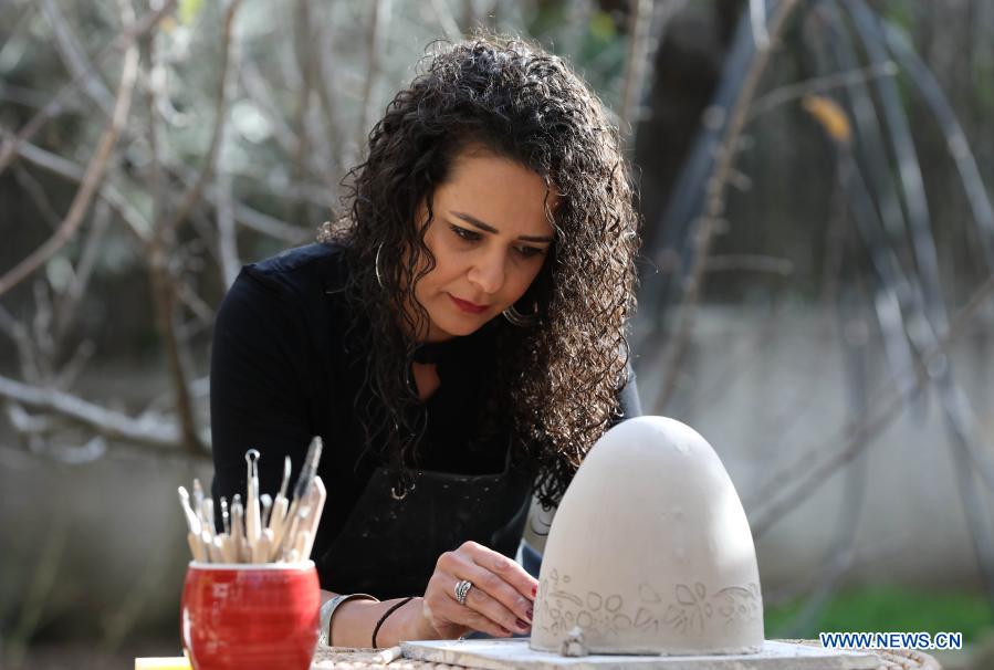 Palestinian artist Suha Hussein works on a ceramic artwork in her house in the West Bank city of Al-Bireh, Jan. 6, 2021. Hussein, 37, makes ceramic pendant lampshades of different sizes and shapes and sells them through social media websites to make a living. (Photo by Ayman Nobani/Xinhua)