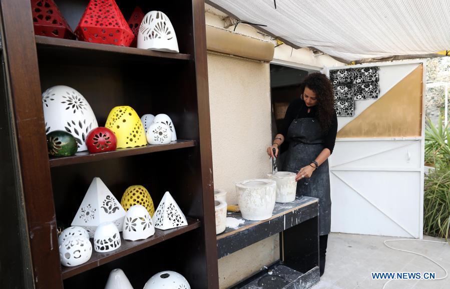 Palestinian artist Suha Hussein shows handmade ceramic artworks in her house in the West Bank city of Al-Bireh, Jan. 6, 2021. Hussein, 37, makes ceramic pendant lampshades of different sizes and shapes and sells them through social media websites to make a living. (Photo by Ayman Nobani/Xinhua)