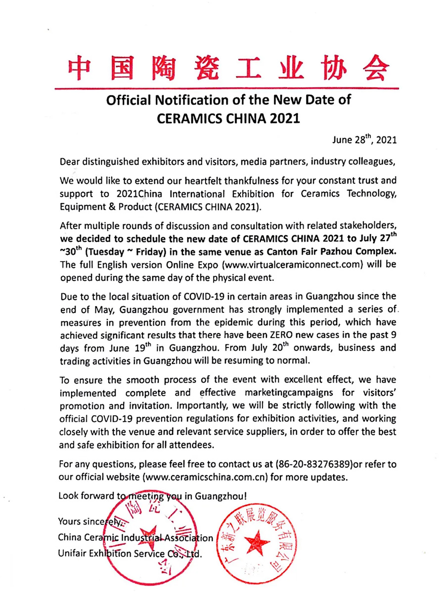 After multiple rounds of discussion and consultation with related stakeholders, we decided to schedule the new date of CERAMICS CHINA 2021 to July 27th ~30th (Tuesday ~ Friday) in the same venue as Canton Fair Pazhou Complex. The full English version Online Expo (www.virtualceramiconnect.com) will be opened during the same day of the physical event.