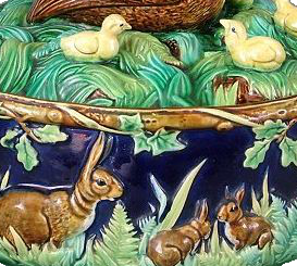 The winner was colored glazes. This was a product inexpensive to produce (paint, fire). Also, around this time the fashion for naturalistic décor was growing. Flora and fauna molded in high relief worked perfectly with the colored glazes.